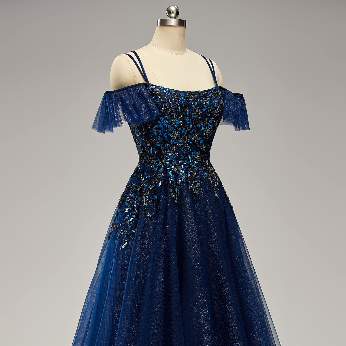 Wholesale Sparkle A Line Off Shoulder Tulle Appliques Beaded Ruffles Prom Dresses