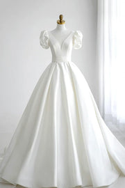 Wholesale White V-Neck Satin Long Prom Dress A-Line Short Sleeve Formal Dress