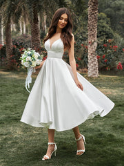 Wholesale A-Line/Princess Ruffles V-neck Sleeveless Satin Tea-Length Wedding Dresses