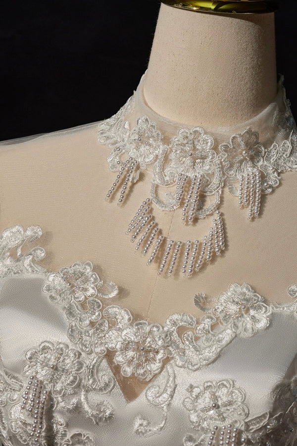 Wholesale A-Line Satin Lace Long Sleeve Prom Dress Elegant White High Neck Evening Prom Dress