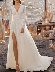 Wholesale Beach Boho Wedding Dresses A-Line V Neck Long Sleeve Court Train Lace Bridal Gowns With Split Front - US 2 / UK 6 / EU 32