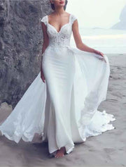 Wholesale Beach Boho Wedding Dresses Mermaid / Trumpet V Neck Cap Sleeve Court Train Chiffon OverSkirts Bridal Gowns With Embroidery Appliques - US 2 / UK 6 / EU 32