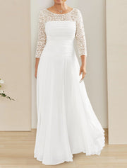 Wholesale Mature Modest Fall Wedding Dresses A-Line Illusion Neck 3/4 Length Sleeve Floor Length Chiffon Bridal Gowns With Ruched Solid Color - US 2 / UK 6 / EU 32