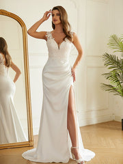 Wholesale Sheath/Column Charmeuse Lace V-neck Sleeveless Sweep/Brush Train Wedding Dresses - US 2 / UK 6 / EU 32