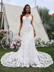 Wholesale Sheath/Column Lace V-neck Sleeveless Sweep/Brush Train Wedding Dresses