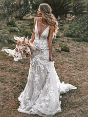 Wholesale Sheath/Column Tulle Chapel Train Applique Sleeveless V-neck Wedding Dresses