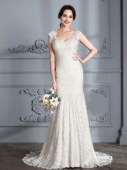 Wholesale Trumpet/Mermaid Sleeveless V-Neck Lace Sweep/Brush Train Wedding Dresses