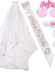 Wholesale Bachelorette Party Bride to Be Kit-1 White Double Ribbon Edge Center Cascade Bridal Wedding Veil with Comb 1 Bride to Be Satin Sash 1 Badge 1 leg lace.1 Pink Bride to be glasses