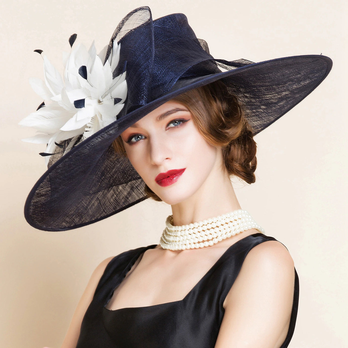 Wholesale Flax Kentucky Derby Hat / Hats with Flower 1 Piece Horse Race / Ladies Day Headpiece - Navy Blue