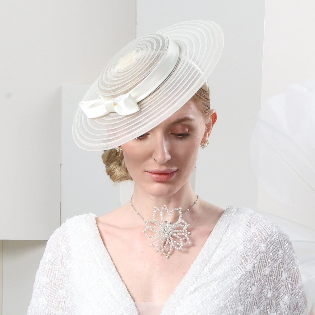 Wholesale Headbands Hats Tulle Straw Bowler / Cloche Hat Saucer Hat Top Hat Tea Party Horse Race Romantic British With Bowknot Headpiece Headwear - Beige