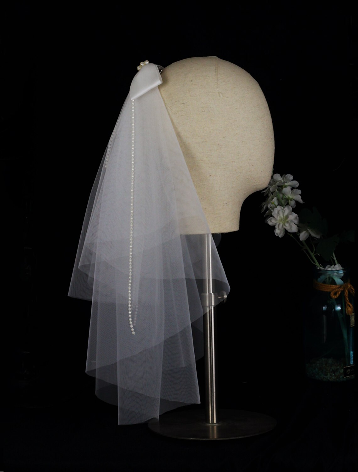 Wholesale Two-tier Cute Wedding Veil Elbow Veils with Faux Pearl / Satin Bow Tulle