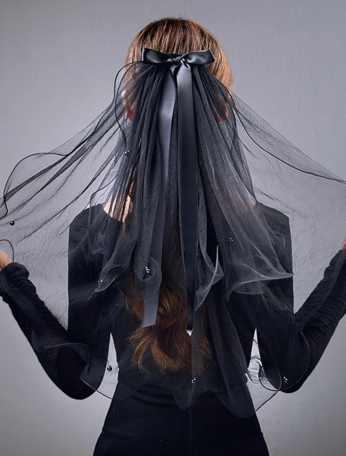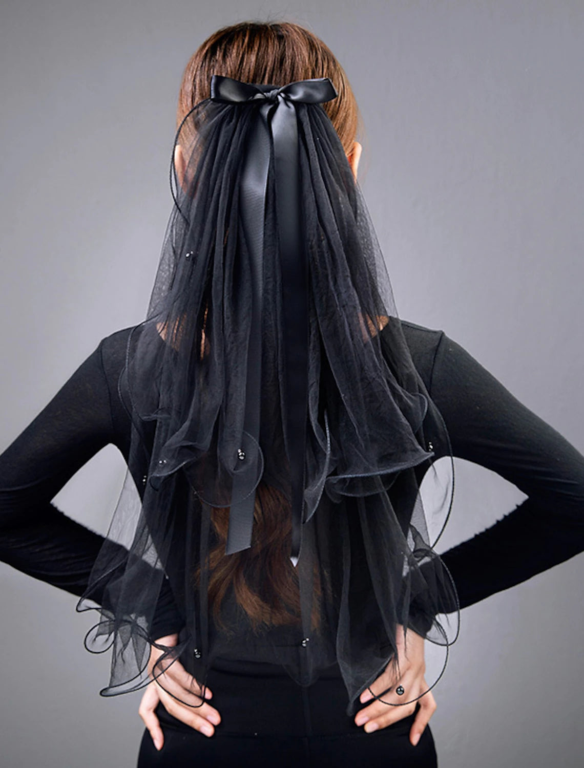 Wholesale Two-tier Personalized / Pearls Wedding Veil Elbow Veils with Faux Pearl / Satin Bow Tulle