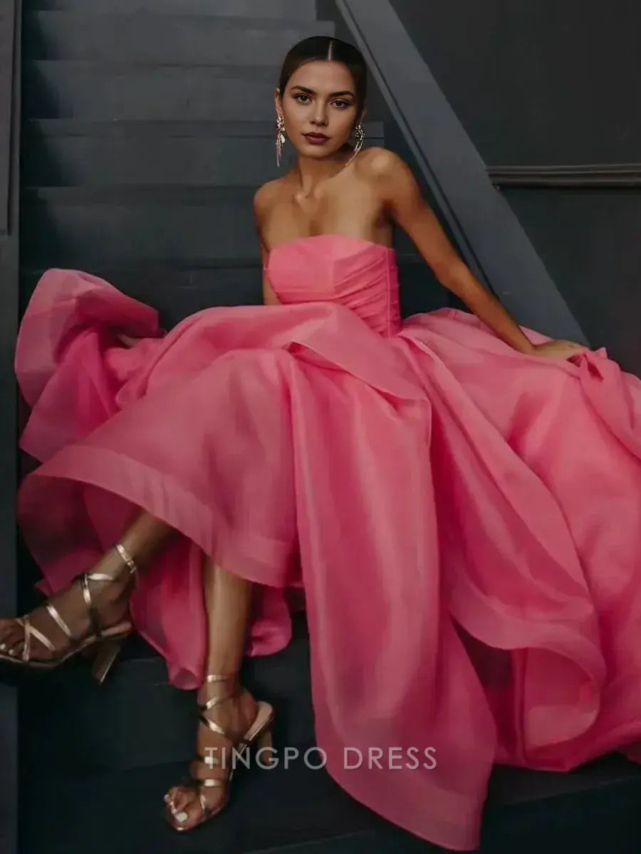 A Line Strapless Organza prom dress: Suitable for: proms, formal dinners, black-tie weddings, and upscale parties.