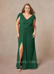 TingPo Wholesale Elegant Plus - Size V - Neck Chiffon Evening Gown with Draped Sleeves, Wrap - Style Bodice, and Side Slit: Ideal for Formal Affairs