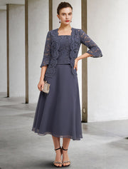 Wholesale A-Line 3 Piece Mother of the Bride Dress Plus Size Elegant Square Neck Tea Length Chiffon Lace Sleeveless Wrap Included Jacket Dresses with Crystals Ruffles