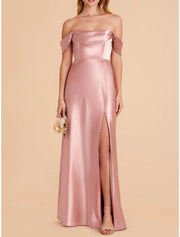 Wholesale A-Line Bridesmaid Dress Spaghetti Strap Sleeveless Pink Ankle Length Stretch Satin with Split Front / Ruching