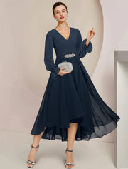 Wholesale A-Line Mother of the Bride Dress Formal Wedding Guest Elegant High Low Scoop Neck V Neck Asymmetrical Tea Length Chiffon Long Sleeve with Crystal Brooch - US 2 / UK 6 / EU 32