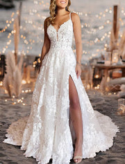 Wholesale Beach Mature Wedding Dresses A-Line Camisole Sleeveless Court Train Lace Bridal Gowns With Pleats Split Front