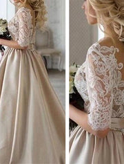 Wholesale Hall Formal Wedding Dresses A-Line Illusion Neck Half Sleeve Court Train Satin Bridal Gowns With Buttons Appliques - US 2 / UK 6 / EU 32