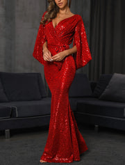 Wholesale Mermaid Evening Gown Sparkle Christmas Red Green Dress Dress Formal Wedding Guest Floor Length Long Sleeve V Neck Fall Wedding Reception Sequined with Bow(s) Sequin