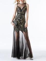 Wholesale The Great Gatsby Dress Vintage Sparkle & Shine Dress Prom Birthday Floor Length Jewel Neck Sleeveless Chiffon with Sequin - Black Gold / US 2 / UK 6 / EU 32